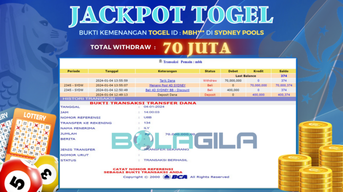 MEMBER BOLAGILA MENERIMA PELUNASAN KEMENANGAN BOLAGILA JACKPOT TOGEL di SYDNEY POOLS Rp 70.000.000,- LUNAS