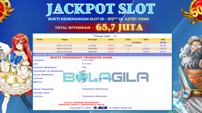 BOLAGILA mengucapkan selamat kepada user id : R12*** yang telah berhasil mendapatkan jackpot SLOT DI AZTEC GEMS. Kemenangan sebesar Rp 65.700.000,-. telah dibayarkan LUNAS oleh pihak bolagila kepada pemilik user id setelah yang bersangkutan mengisi formulir withdraw. Proses pencairan dana berlangsung sangat cepat hanya dalam waktu 6-11 menit sudah berada dalam rekening pemilik user id.