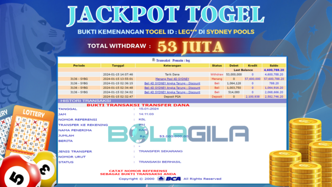 MEMBER BOLAGILA MENERIMA PELUNASAN KEMENANGAN BOLAGILA JACKPOT TOGEL di SYDNEY POOLS Rp 53.000.000,- LUNAS