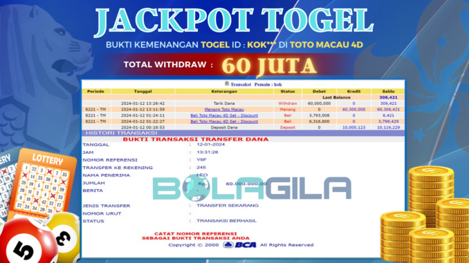 BOLAGILA JACKPOT TOGEL di TOTO MACAU 4D Rp 60.000.000,- LUNAS