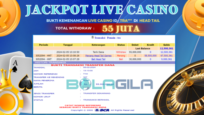 MEMBER BOLAGILA MENERIMA PELUNASAN KEMENANGAN JACKPOT LIVE CASINO DI HEAD TAIL Rp 55.000.000,- LUNAS