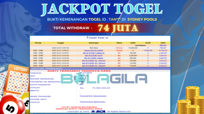 BOLAGILA JACKPOT TOGEL DI SYDNEY POOLS Rp 74.000.000,- LUNAS