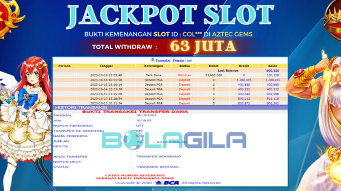 BOLAGILA mengucapkan selamat kepada user id : COL*** yang telah berhasil mendapatkan jackpot pada permainan SLOT DI AZTEC GEMS. Kemenangan sebesar Rp 63.000.000,-. telah dibayarkan LUNAS oleh pihak bolagila kepada pemilik user id setelah yang bersangkutan mengisi formulir withdraw. Proses pencairan dana berlangsung sangat cepat hanya dalam waktu 6-11 menit sudah berada dalam rekening pemilik user id.
