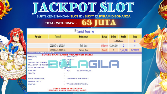 MEMBER BOLAGILA MENERIMA PELUNASAN KEMENANGAN JACKPOT SLOT DI PYRAMID BONANZA RP 63.000.000,- LUNAS