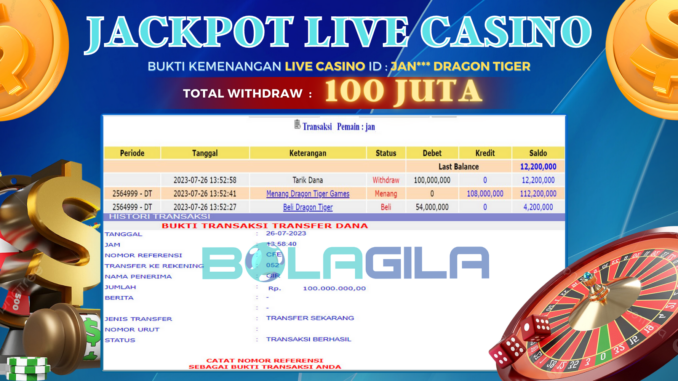 BOLAGILA JACKPOT LIVE CASINO DI DRAGON TIGER RP 100.000.000,- LUNAS