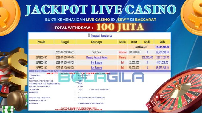 BOLAGILA JACKPOT LIVE CASINO DI BACCARAT Rp 100.000.000,- LUNAS