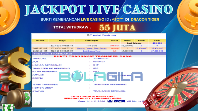 MEMBER BOLAGILA MENERIMA PELUNASAN JACKPOT LIVE CASINO DI DRAGON TIGER Rp 55.000.000,- LUNAS
