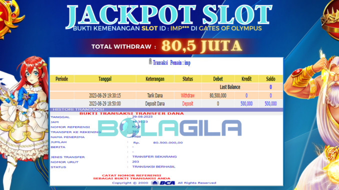 BOLAGILA mengucapkan selamat kepada user id : IMP*** yang telah berhasil mendapatkan jackpot pada permainan SLOT di GATES OF OLYMPUS. Kemenangan sebesar Rp 80.500.000,-. telah dibayarkan LUNAS oleh pihak bolagila kepada pemilik user id setelah yang bersangkutan mengisi formulir withdraw. Proses pencairan dana berlangsung sangat cepat hanya dalam waktu 6-11 menit sudah berada dalam rekening pemilik user id.