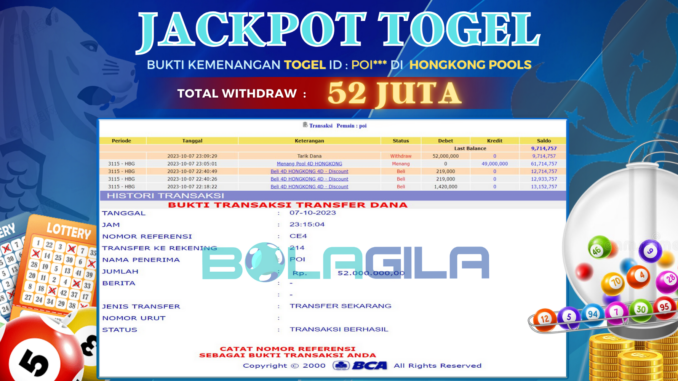 MEMBER BOLAGILA MENERIMA PELUNASAN JACKPOT TOGEL di HONGKONG POOLS Rp 52.000.000,- LUNAS