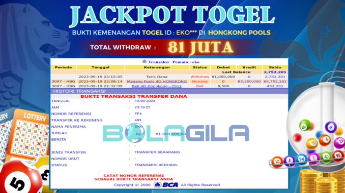 BOLAGILA mengucapkan selamat kepada user id : EKO*** yang telah berhasil mendapatkan jackpot pada permainan TOGEL di HONGKONG POOLS . Kemenangan sebesar Rp 81.000.000,-. telah dibayarkan LUNAS oleh pihak bolagila kepada pemilik user id setelah yang bersangkutan mengisi formulir withdraw. Proses pencairan dana berlangsung sangat cepat hanya dalam waktu 6-11 menit sudah berada dalam rekening pemilik user id.