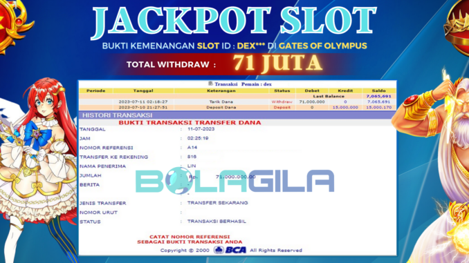 BOLAGILA mengucapkan selamat kepada user id : DEX*** yang telah berhasil mendapatkan jackpot pada permainan SLOT DI GATES OF OLYMPUS. Kemenangan sebesar Rp 71.000.000,-. telah dibayarkan LUNAS oleh pihak bolagila kepada pemilik user id setelah yang bersangkutan mengisi formulir withdraw. Proses pencairan dana berlangsung sangat cepat hanya dalam waktu 6-11 menit sudah berada dalam rekening pemilik user id.